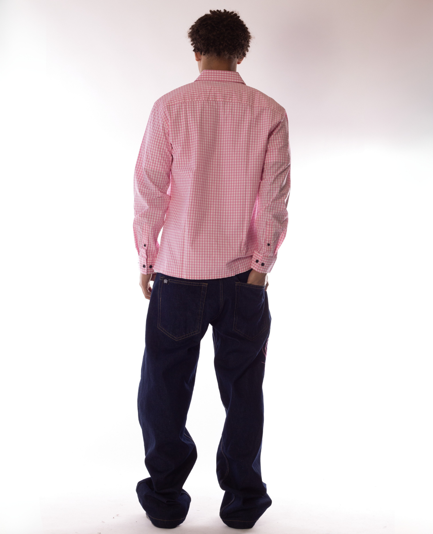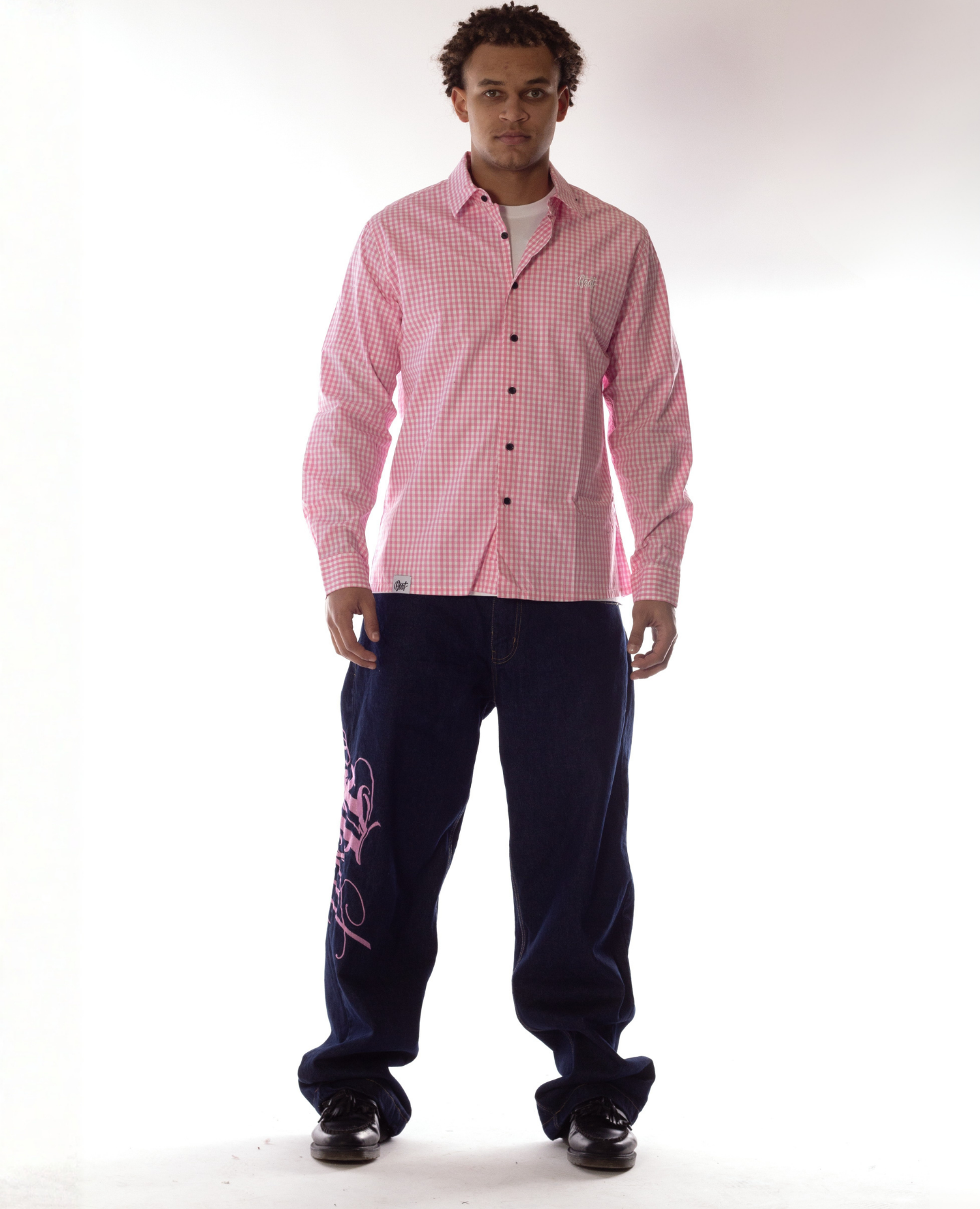 The Art Script embroidery adds depth and character, standing out against the indigo base while the rose pink tone brings contrast and warmth to the overall look. Balanced, expressive, and easy to style as part of a full fit or on their own.