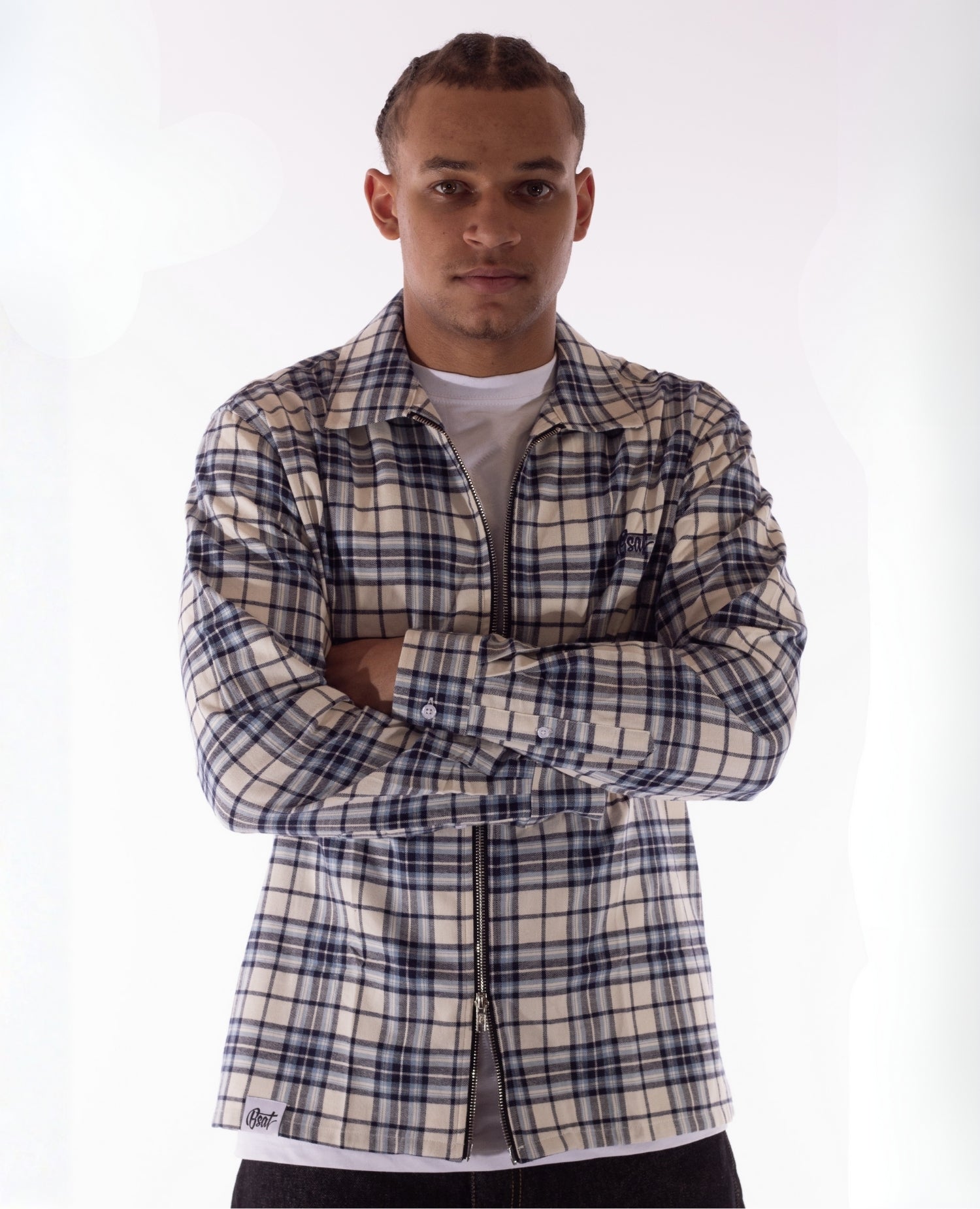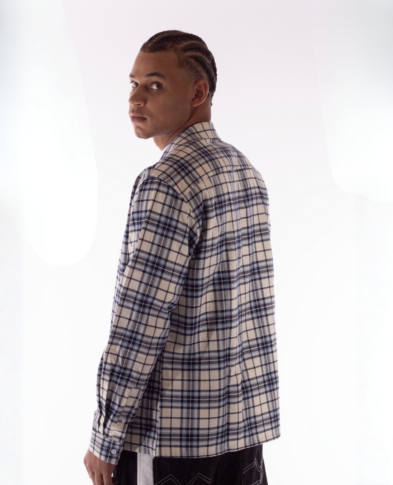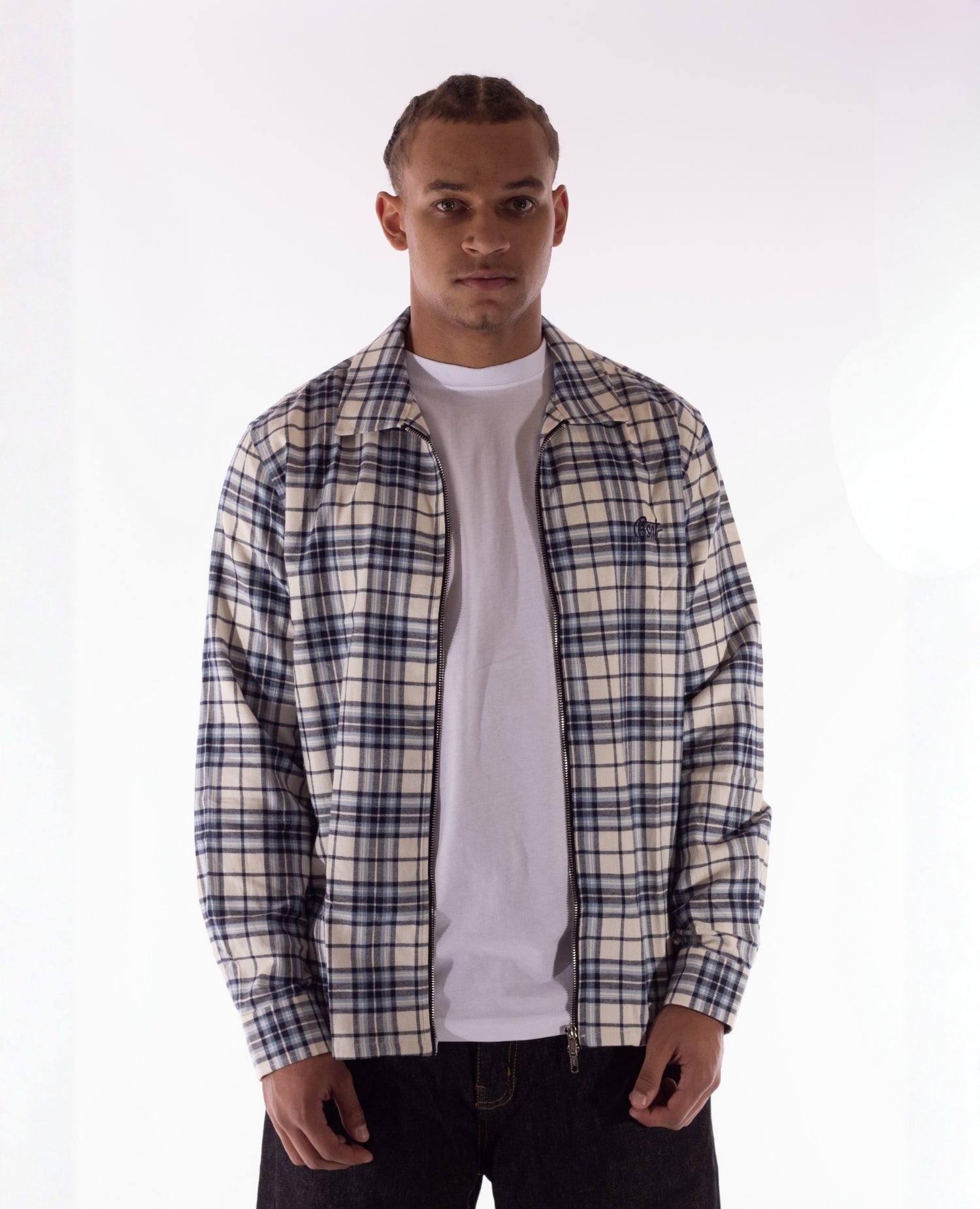 BSAT Studio Flannel Zip Shirt – Grid Navy er lavet i blød, børstet flannel med en grafisk blå/hvid tern og fuld zip. Den fungerer både som skjorte og let overshirt – til indendørs chill og udendørs lag-på-lag.