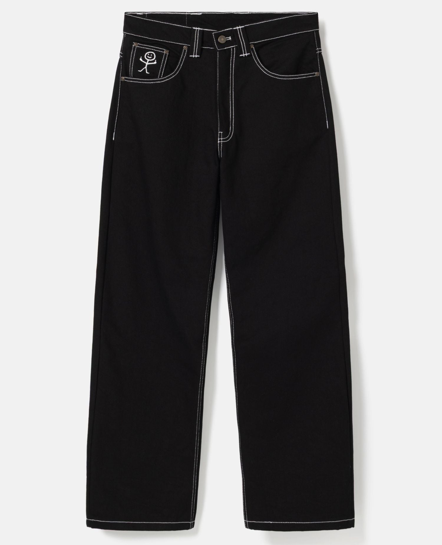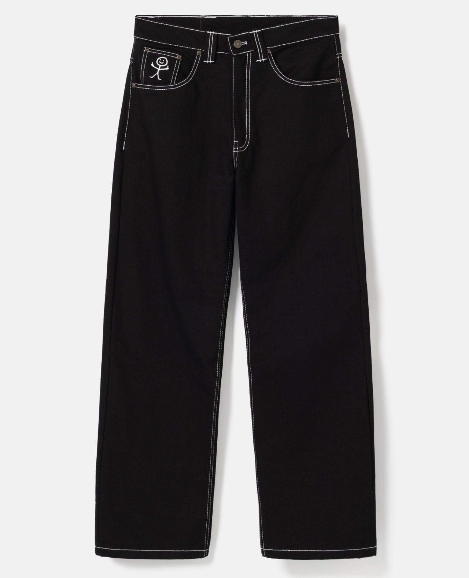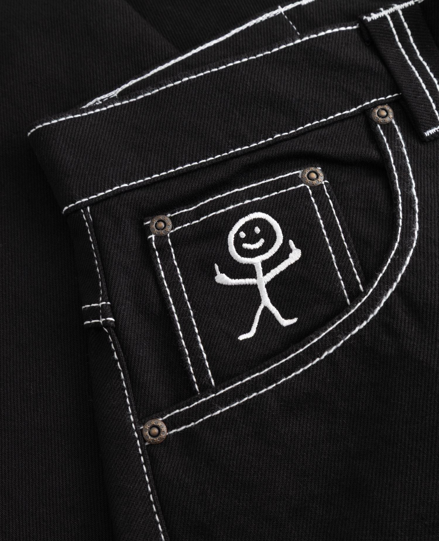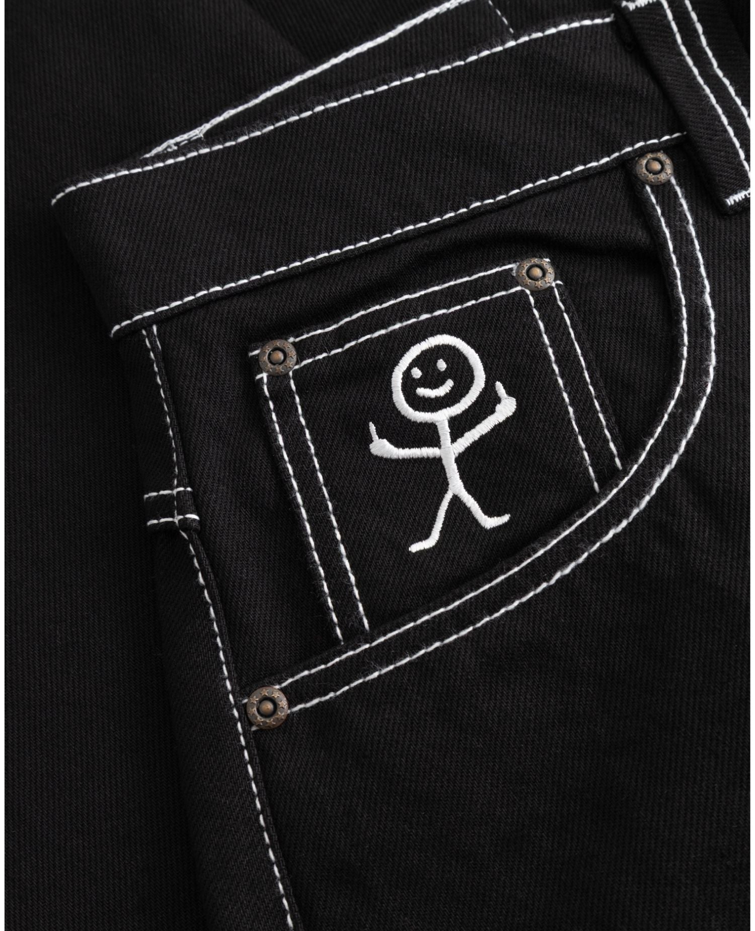 Stickman The Fingers Jeans er et design, hvor BSAT brand logoet har fået følgeskab af en lille figur, som giver et f*ck. Tændstik figuren folder sig også ud på møntlommen i en hvid brodering. Frækt og sjovt.