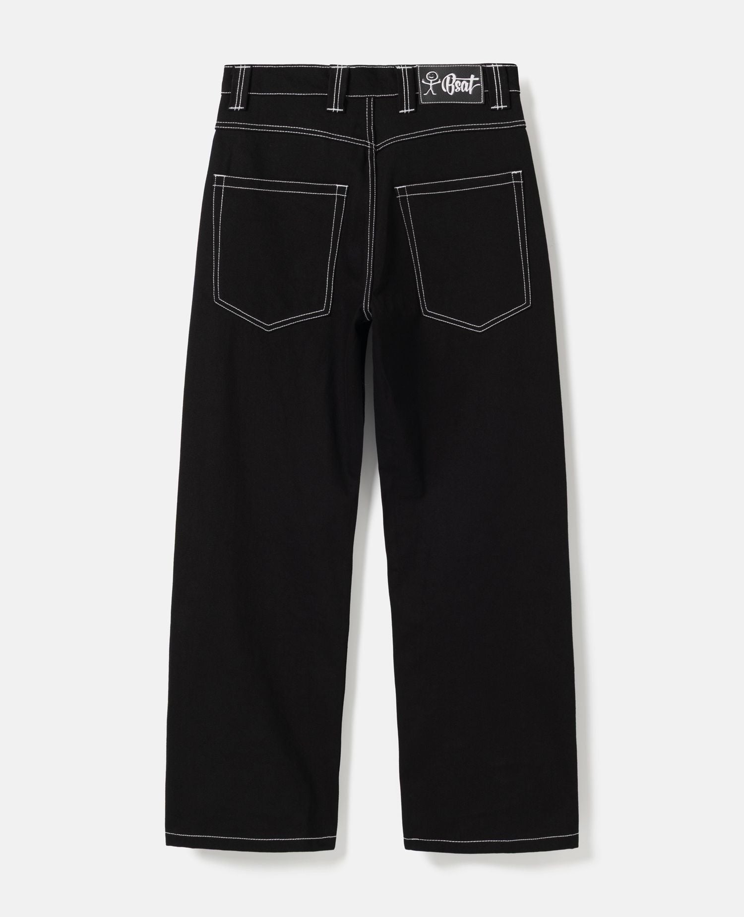 De coole Baggy Jeans er sorte, med brede bælte loops, der er tydeligt markerede med hvide syninger som alle andre syninger i øvrigt.