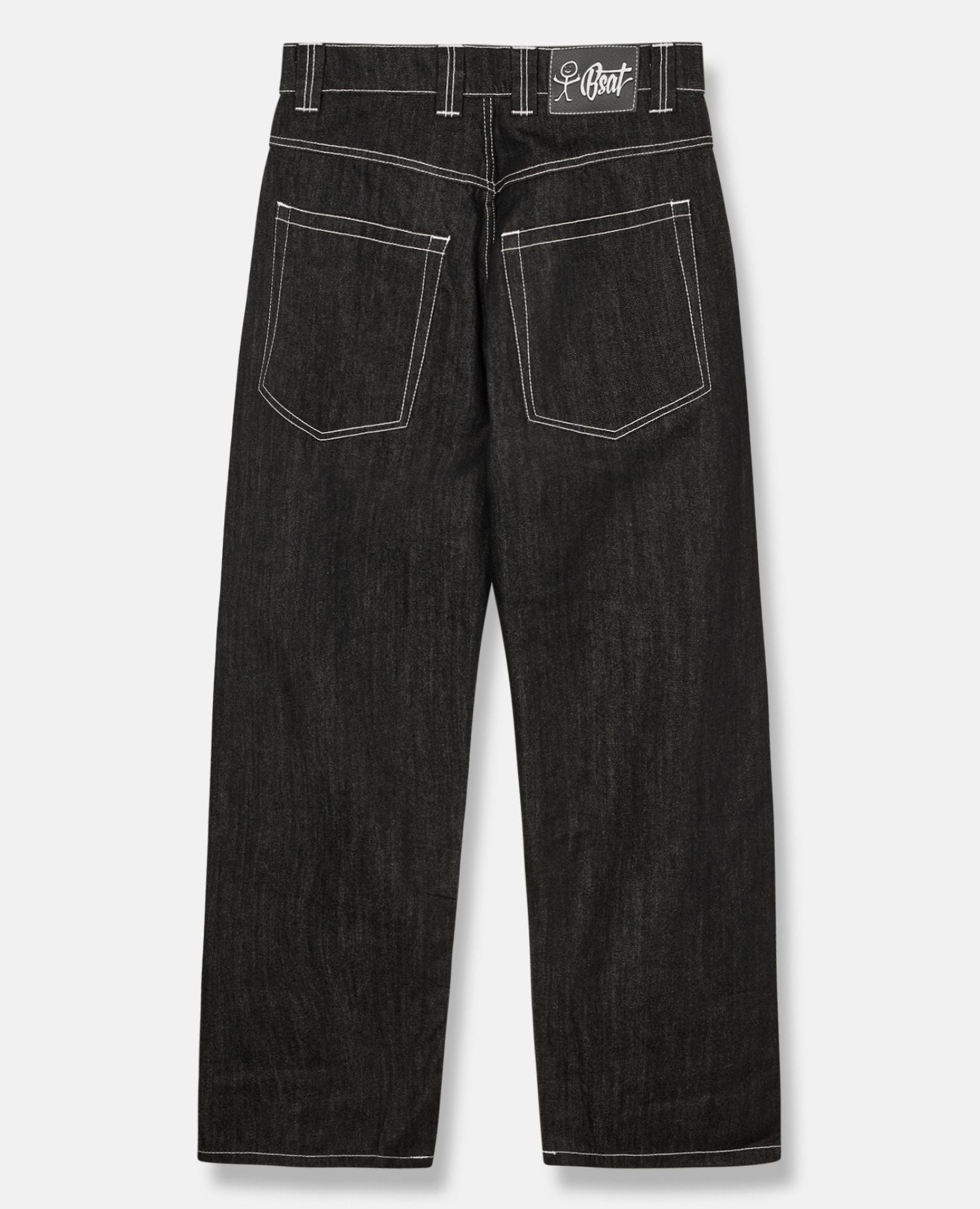 De coole Baggy Jeans er sorte, med brede bælte loops, der er tydeligt markerede med hvide syninger som alle andre syninger i øvrigt.